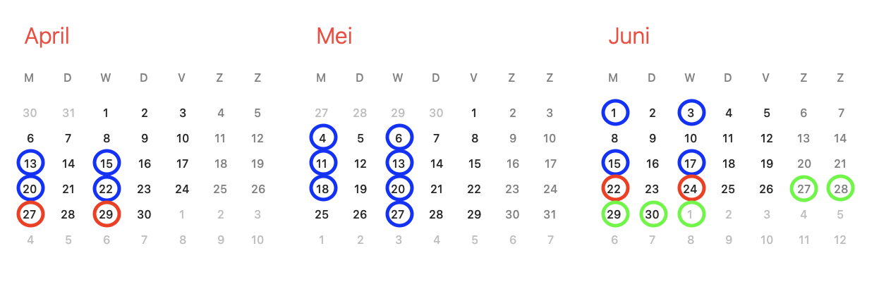 Please note that the red circles indicate the days where you can catch-up a missed class. Green circles indicate mold making week. Mold making is optional and not included in the course fee.